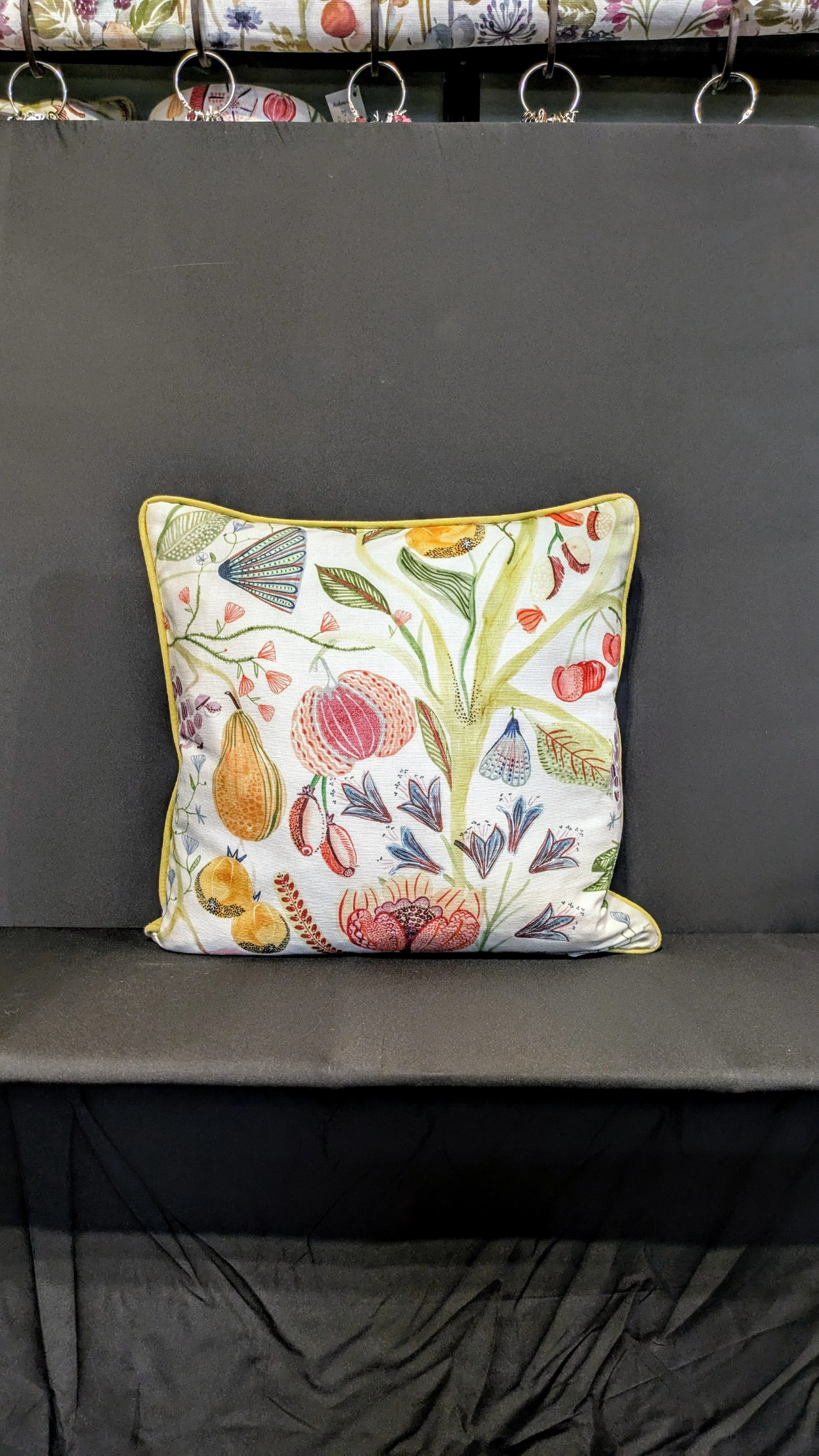 Quirky linen cushion, handmade by Pauline Bentley using limited edition Nicki Szabo fabric. Piped and backed using a contrasting fabric. Cushion pad included.
